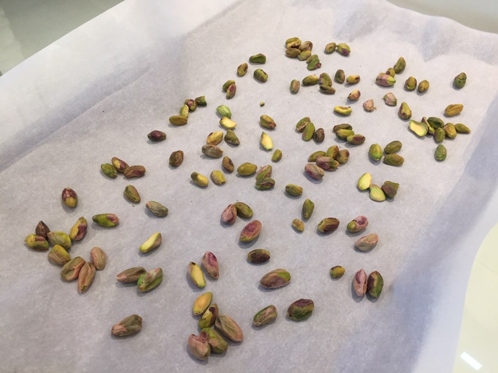 Roast pistachios in oven at 350 F for about 5 minutes.