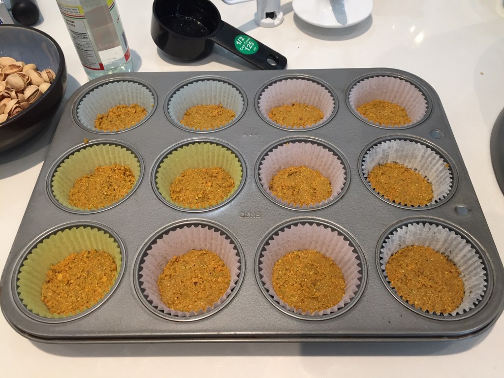 Press into muffin tins to form a base for the cheesecakes.