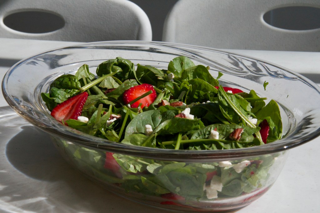 - Sprinkle some of the strawberries, goat cheese, and pecans on top as garnish for aesthetics.
