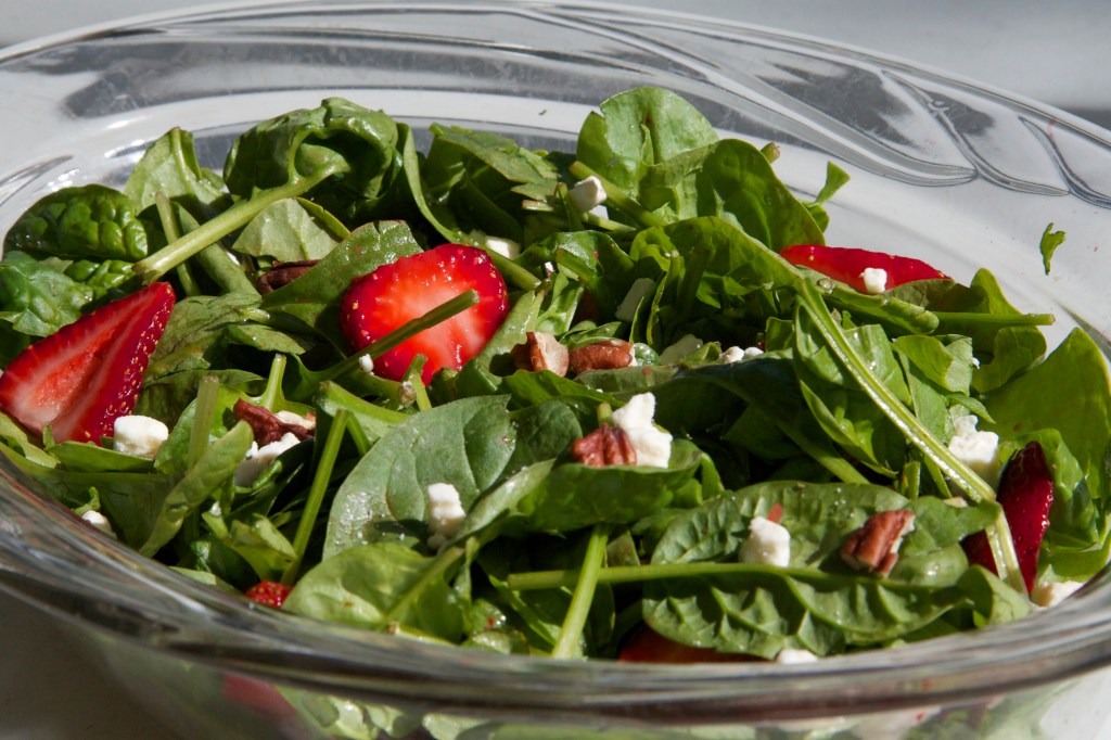 Toss the spinach and arugula with a desired amount of dressing until well coated. Lightly toss in the strawberry slices, goat cheese, and pecans.