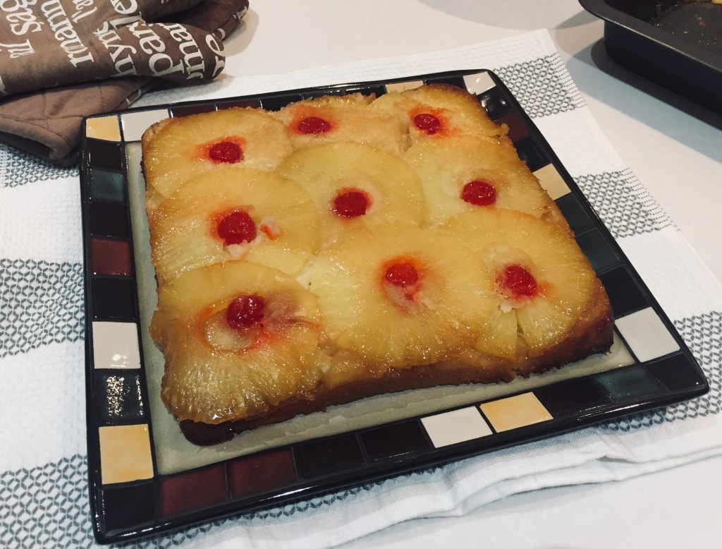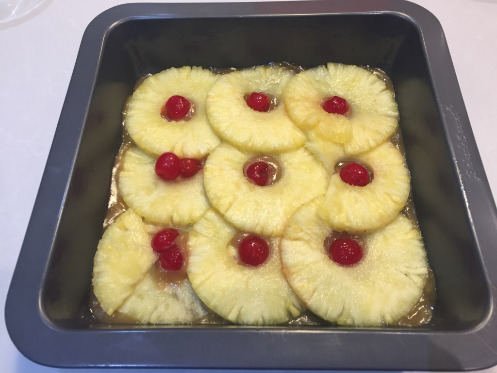Lay out the pineapple slices on top of the butter mixture. Place cherries in the middle of the pineapples. Press down the fruits so that it touches the pan. Set aside.