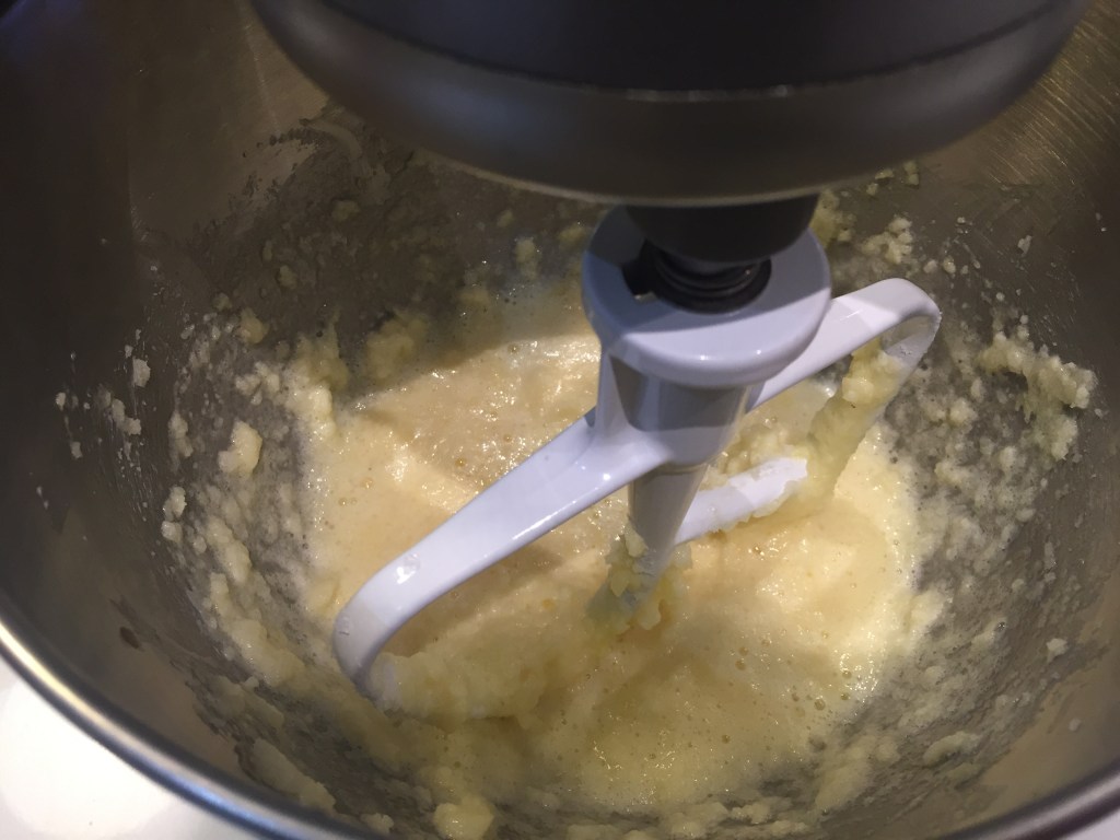 In a mixing bowl, cream together the butter and sugar until it is a creamy and fluffy texture. Beat in the eggs and vanilla until well blended.