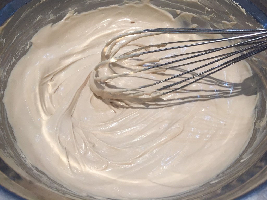 In a double boiler, whisk the cream cheese, butter, and milk until smooth. Add the instant coffee and stir until dissolved.