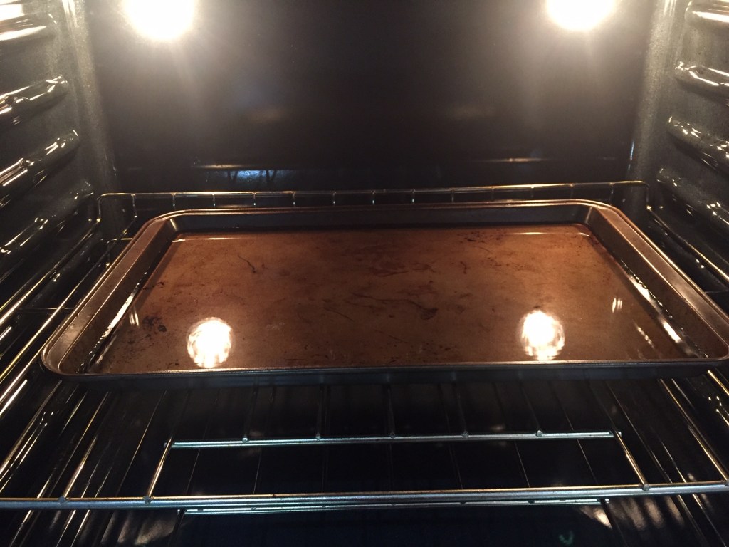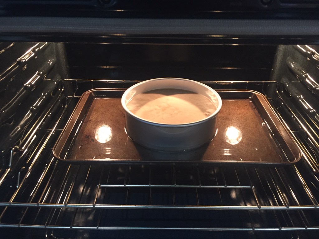 Preheat oven to 250 F. Insert a baking tray filled with water. Make sure the water will not overflow when you place the cake pan on it.