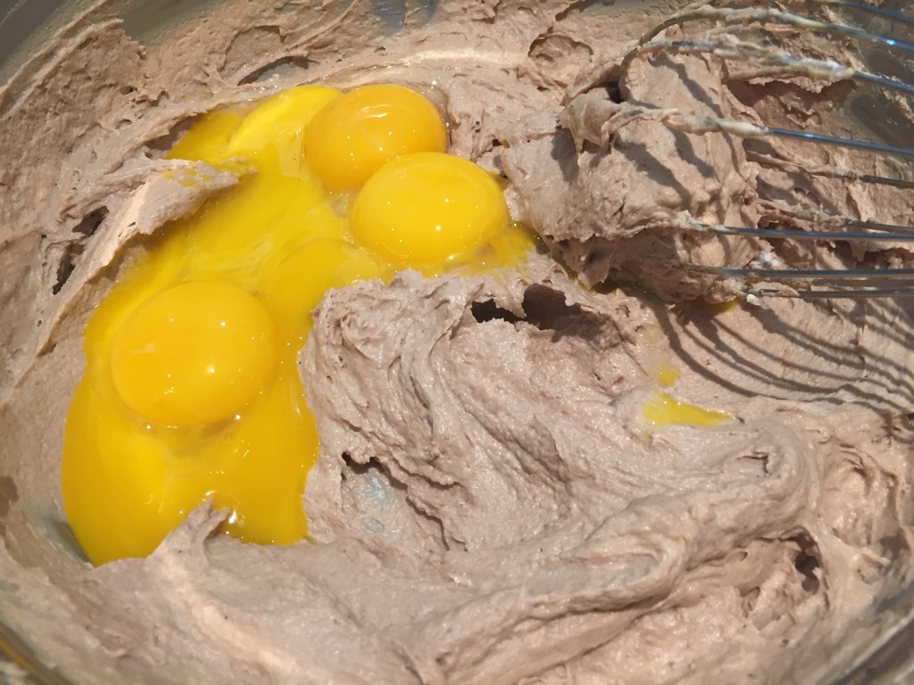 Whisk in the egg yolks one at a time.