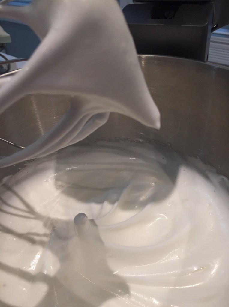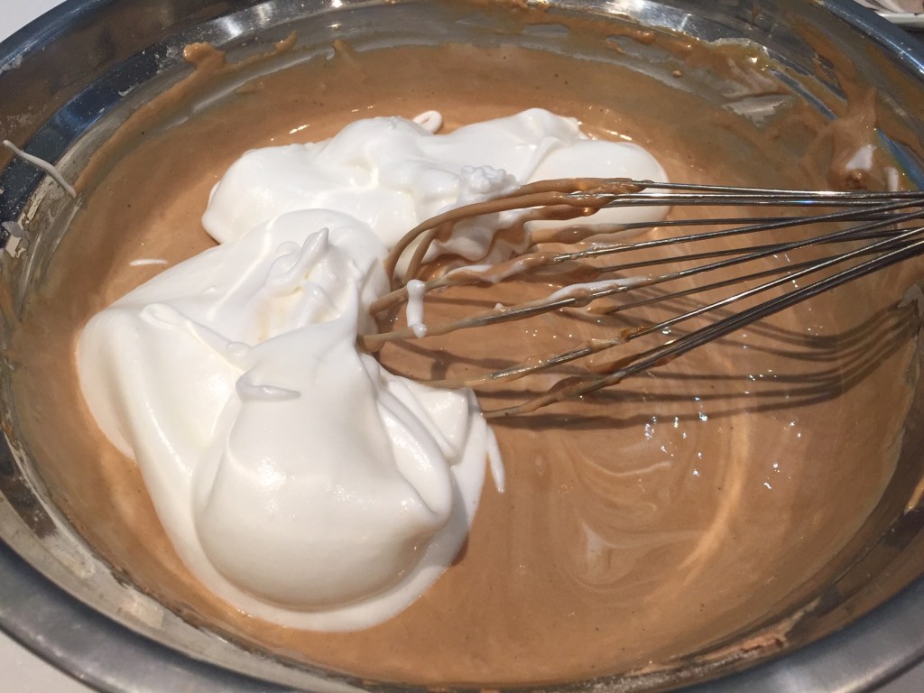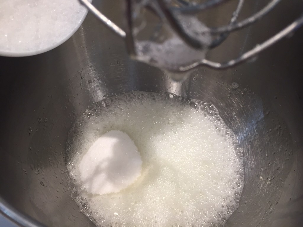 In a separate bowl, whisk egg whites until white and foamy. Then add the sugar and continue whisking to firm peaks.