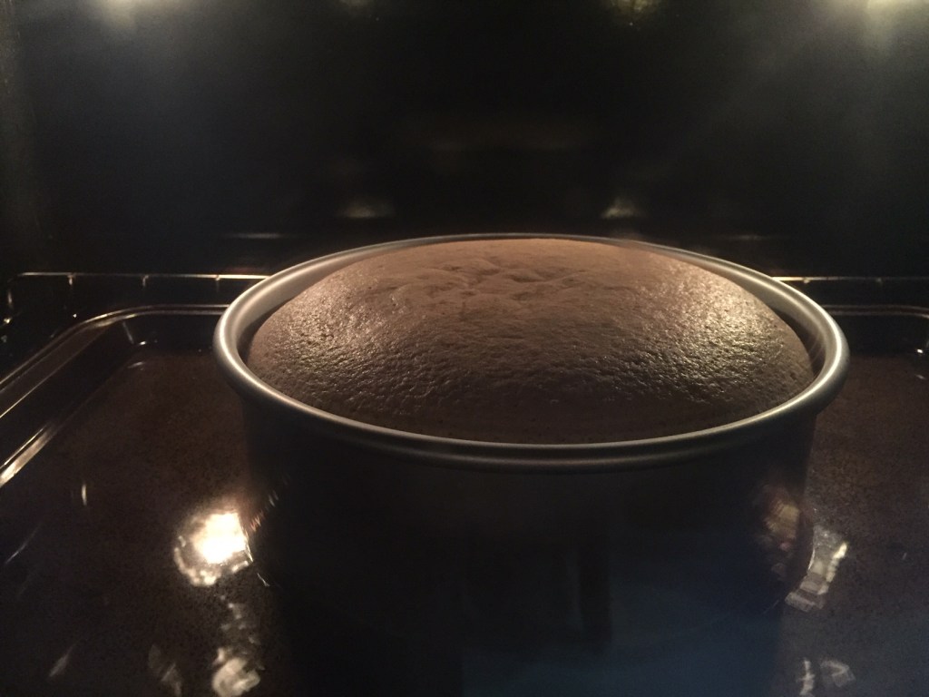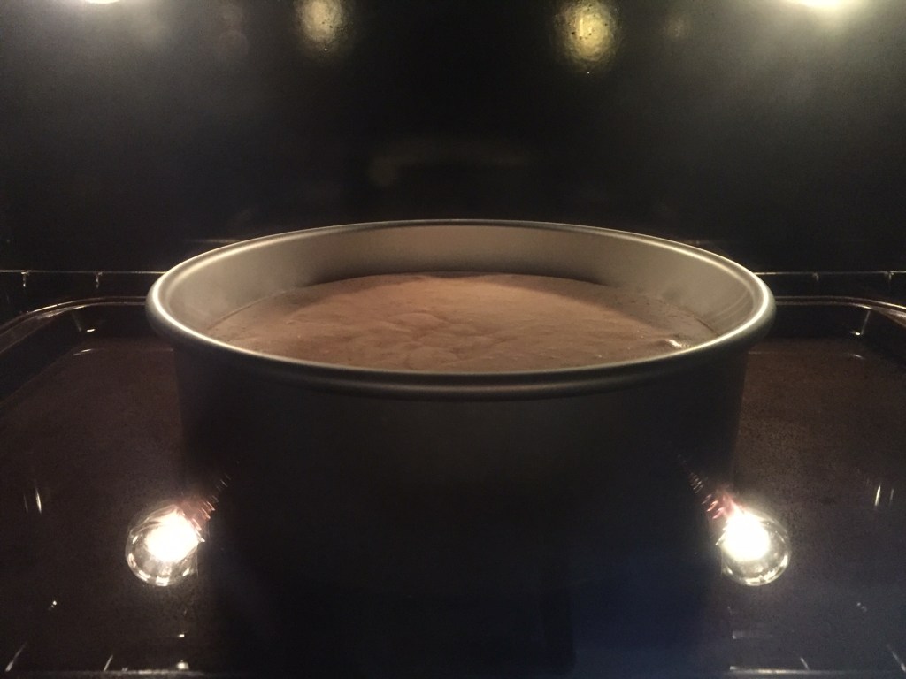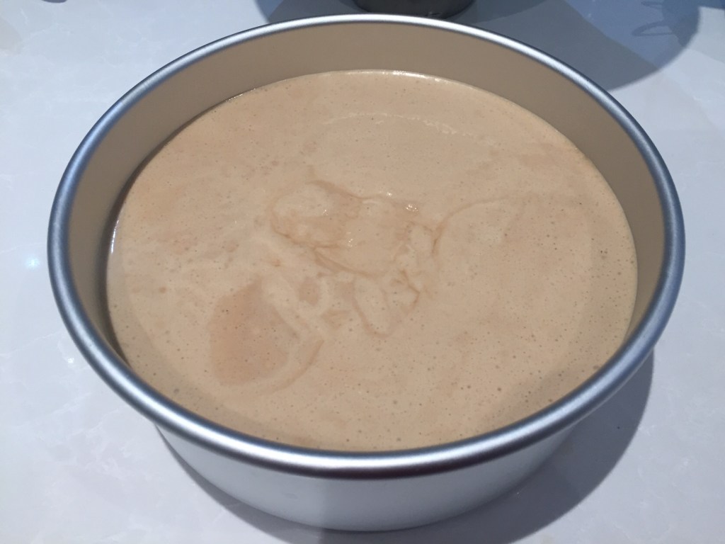 Pour the mixture into the cake pan. Tap it on the counter a few times to release any large air bubbles.